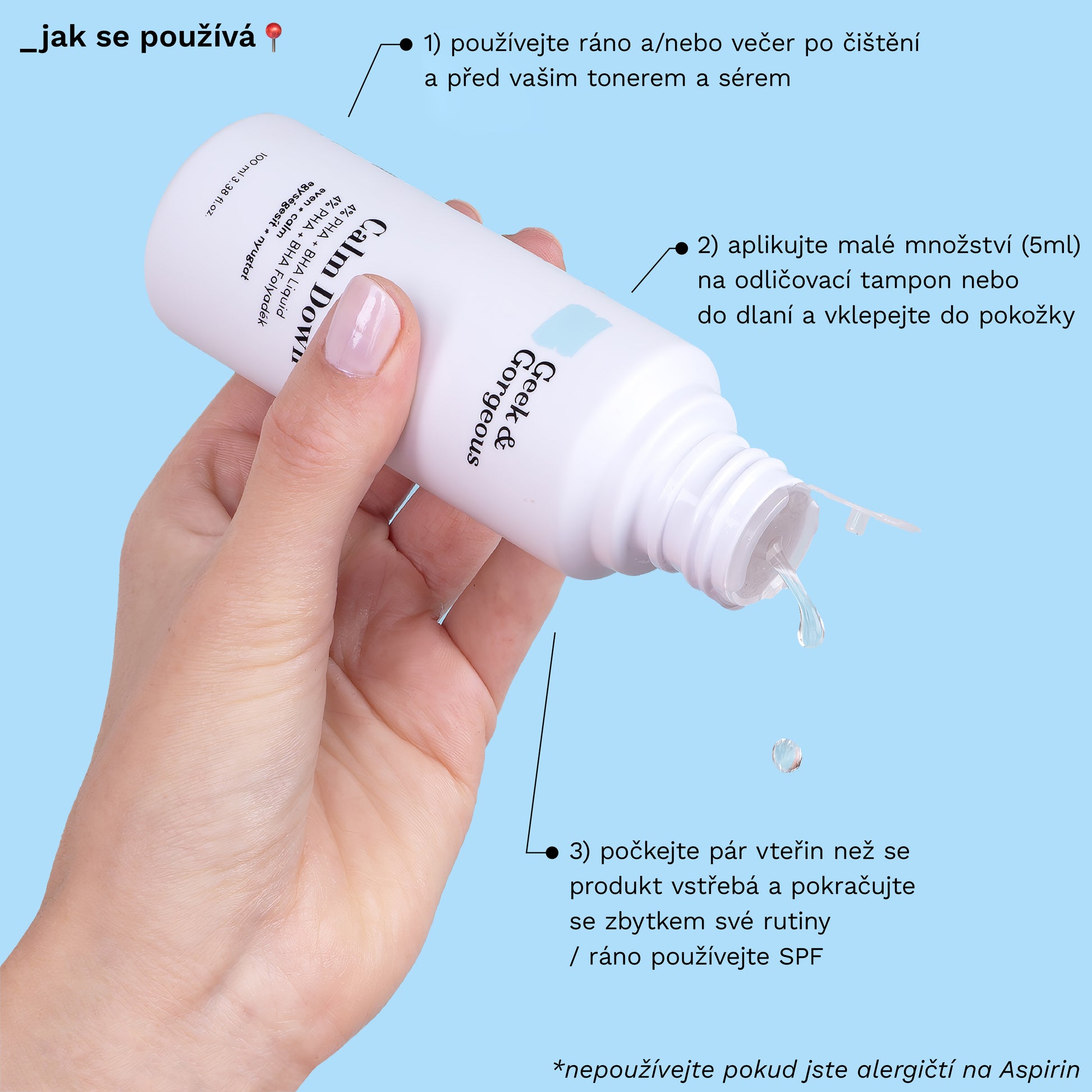 Je to ideální první krok po vyčištění pleti. Použijte ho jako tonikum, buď s vatovým tamponem, nebo si ho nalijte do rukou a vklepejte jak to dělají muži po holení. Počkejte, až se vstřebá (mezitím si vyčistěte zuby :)) a můžete pokračovat oblíbenými séry a hydratačními krémy.DŮLEŽITÉ: Produkt obsahuje BHA, nepoužívejte jej, pokud jste alergičtí na Aspirin.